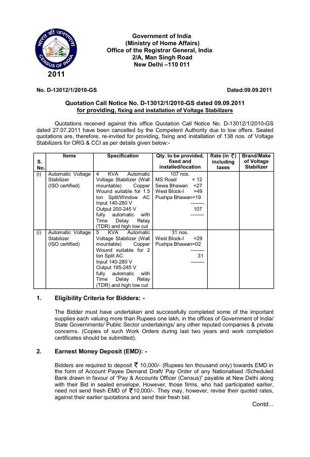 Quotation Call Notice for providing, fixing and installation of Voltage Stabilizers (ORGI - New Delhi)