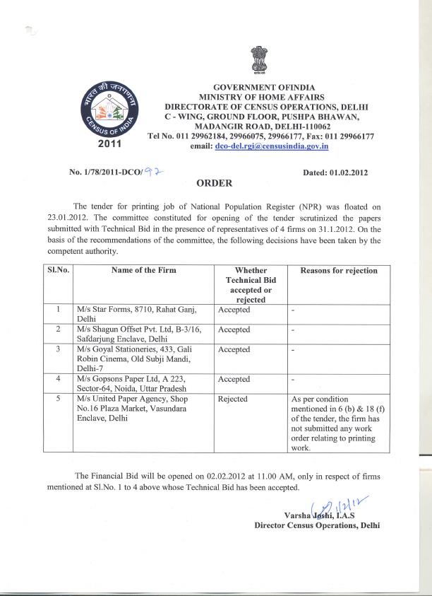 Order regarding opening of Financial Bid for printing job of National Population Register (NPR) (DCO - Delhi)