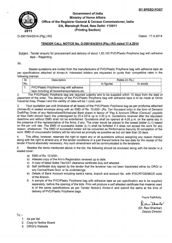 Tender for procurement and delivery of about 1,00,100 PVC/ Plastic polythene bag with adhesive tape [ORGI - New Delhi]