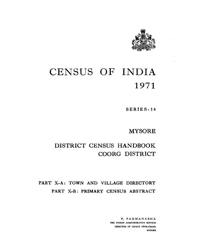 District Census Handbook, Coorg, Part X-A, B, Series-14,Mysore - Census 1971