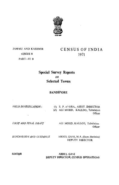 Special Survey Reports on Selected Towns, Bandipore, Part-VI B, Series-8 - Census 1971