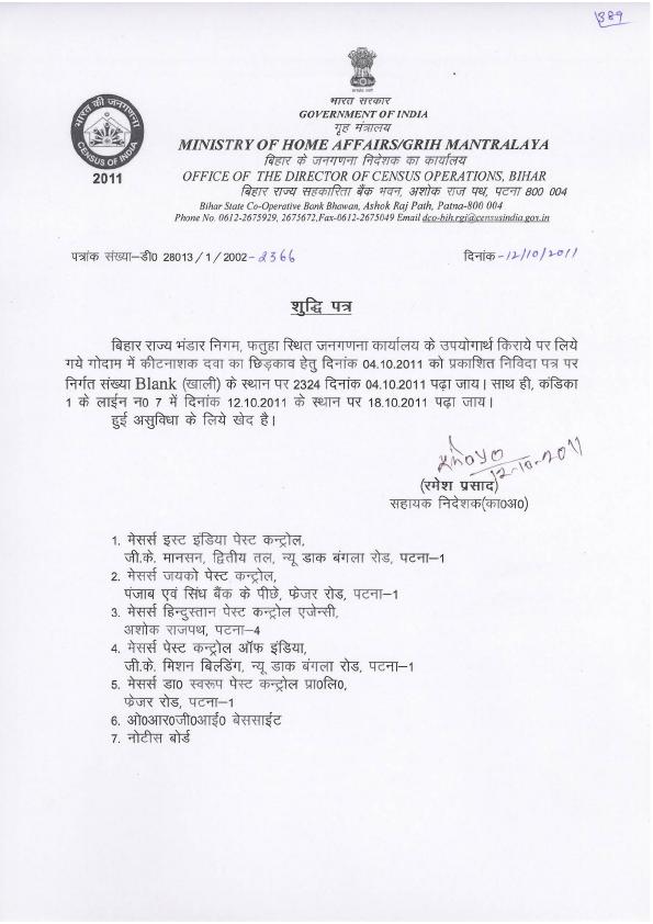 Corrigendum Notice Pertaining to Pest Control in BSWC Godown, Fatuha (DCO - Bihar)