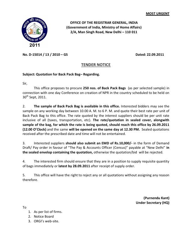 Quotation for Back Pack Bag (ORGI - New delhi)