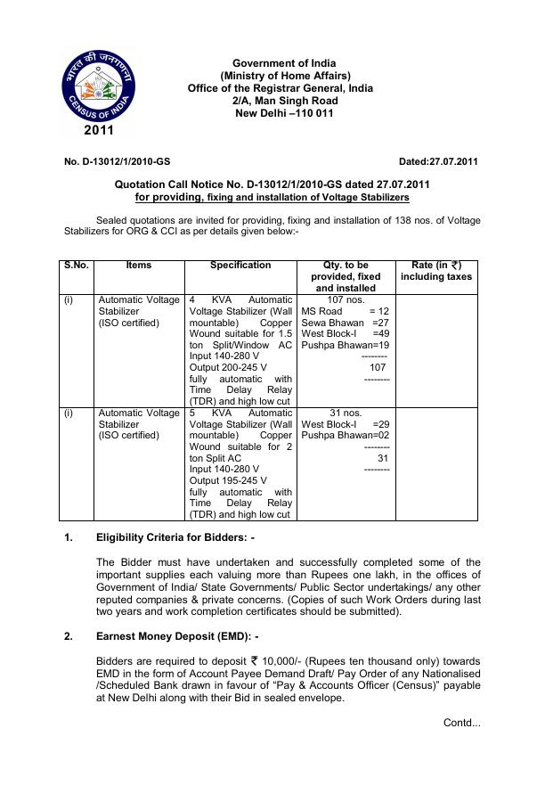 Sealed quotations are invited for providing, fixing and installation of 138 nos. of Voltage Stabilizers for ORG & CCI (ORGI-New Delhi)