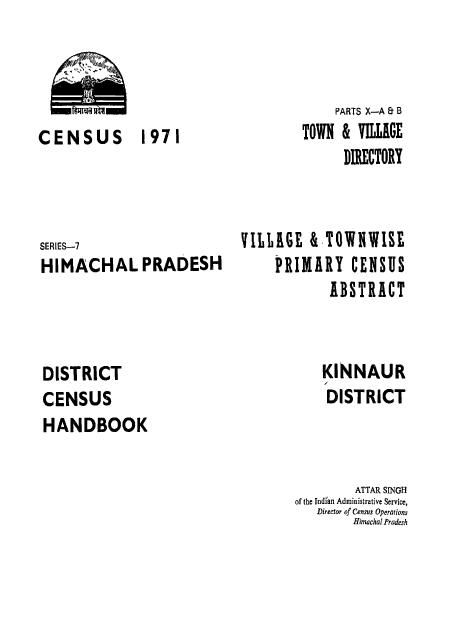 Village & Town wise Primary Census Abstract, Kinnaur, Part-X-A & B, Series-7, Himachal Pradesh - Census 1971