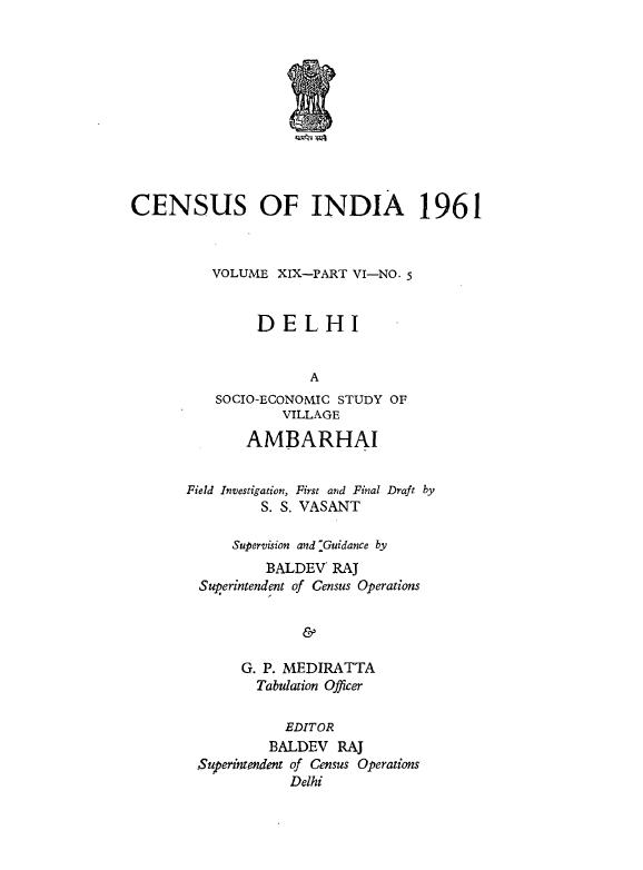Socio-Economic Study of Village, Ambarhai, Part VI No-5, Vol-XIX, Delhi - Census 1961
