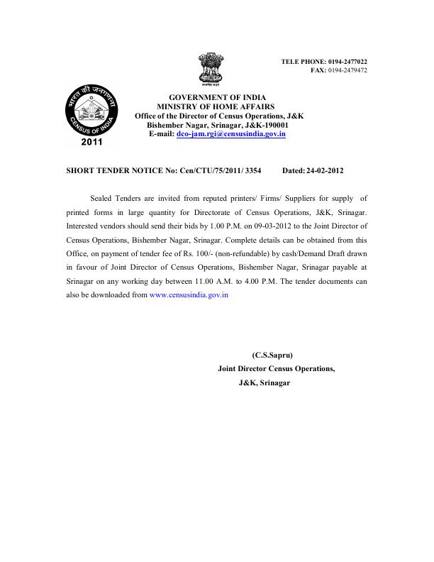Tender for supply of printed forms in large quantity (DCO - Jammu & Kashmir)