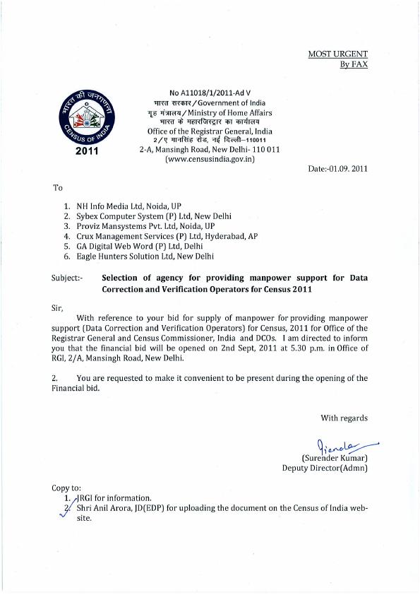 Selection of agency for providing manpower support for Data Correction and Verification Operators for Census 2011 (ORGI - New Delhi)