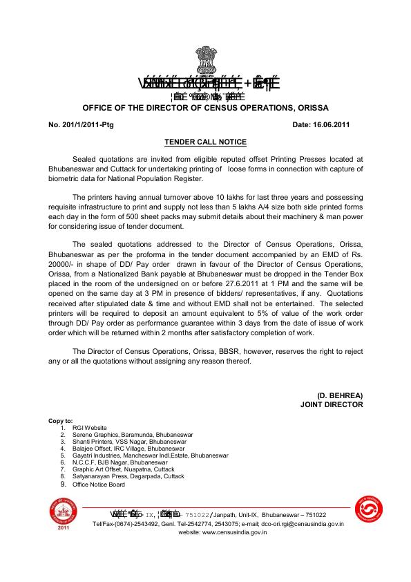 Sealed Quotations are invited from the Printing Presses located at Bhubaneswar and Cuttack for undertaking printing of loose forms in connection with capture of biometric data for National Population Register. (DCO-Orissa)