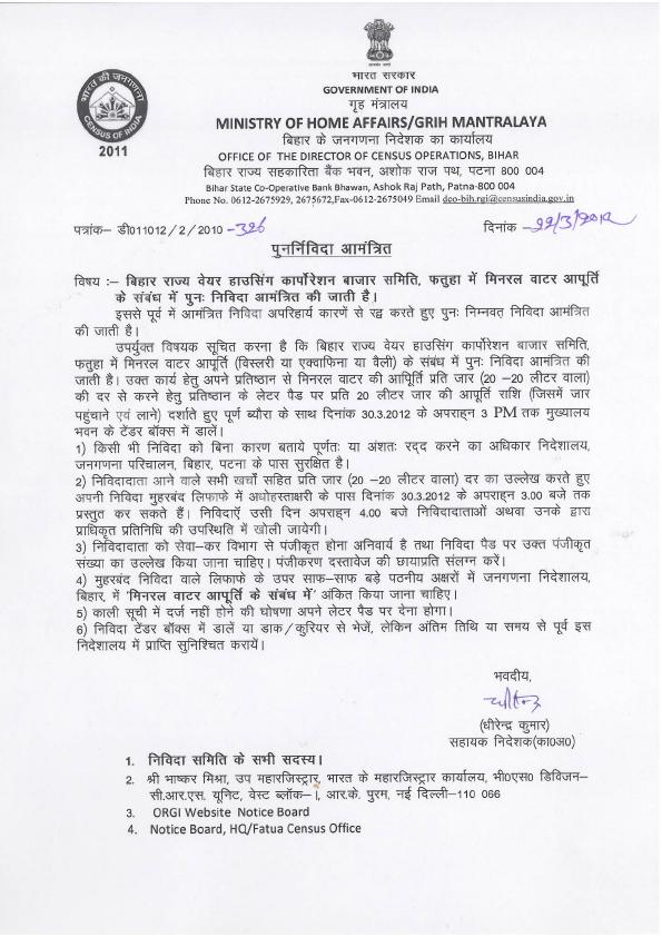 Re-Tender for supply of mineral water at BSWC Fatuha godown (DCO -Bihar)
