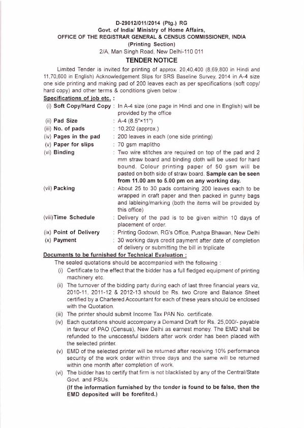 Sealed Quotations are invited from the Printing Presses located at Bhubaneswar and Cuttack for undertaking printing of loose forms in connection with capture of biometric data for National Population Register. (DCO-Orissa)
