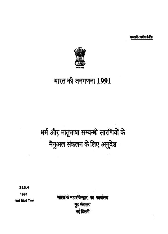 Dharam or Matrabhasa Sambanthi Sarniyon ke Manual Sankalan ke liye Anudesh - Census 1991
