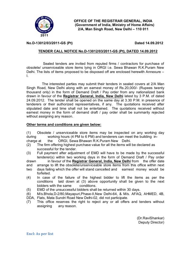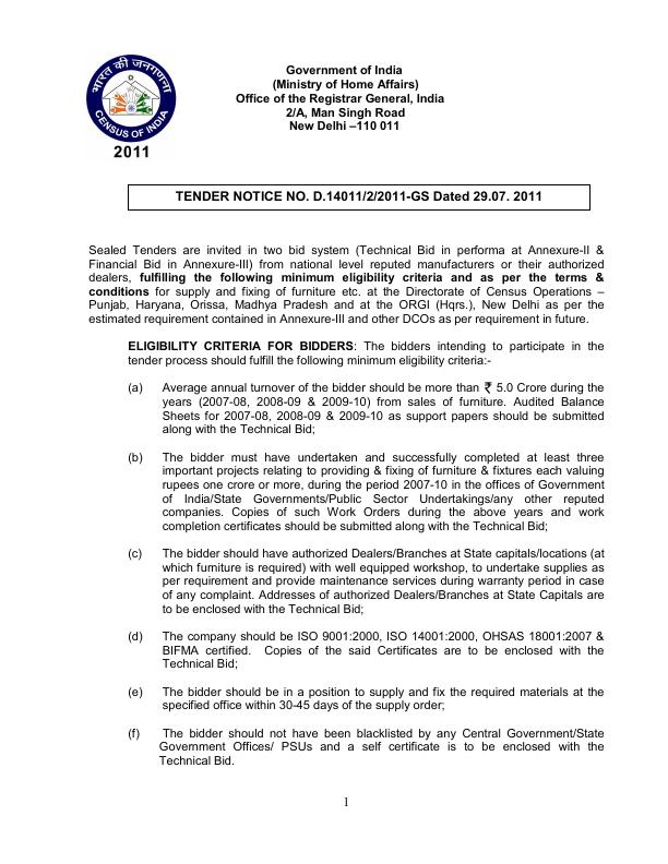 Sealed Tenders are invited in two bid system (Technical Bid in performa at Annexure-II & Financial Bid in Annexure-III) from national level reputed manufacturers or their authorized dealers, (ORGI-New Delhi )