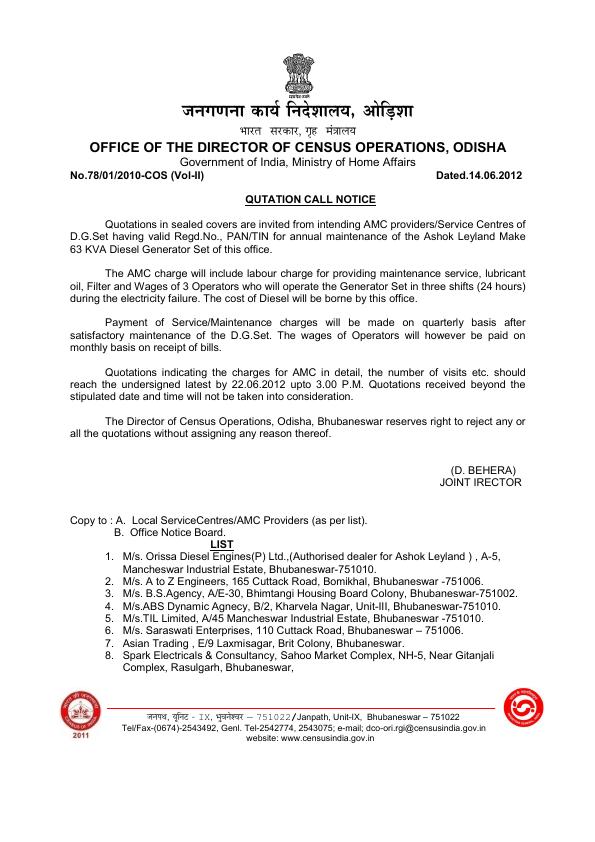 Tender for AMC providers/Service Centres of D.G.Set having valid Regd.No., PAN/TIN for annual maintenance of the Ashok Leyland (DCO - Odisha)