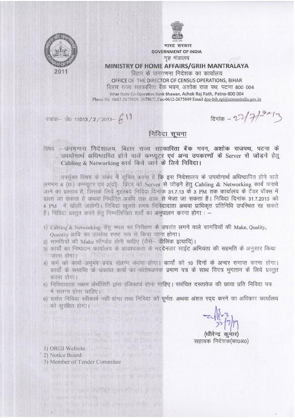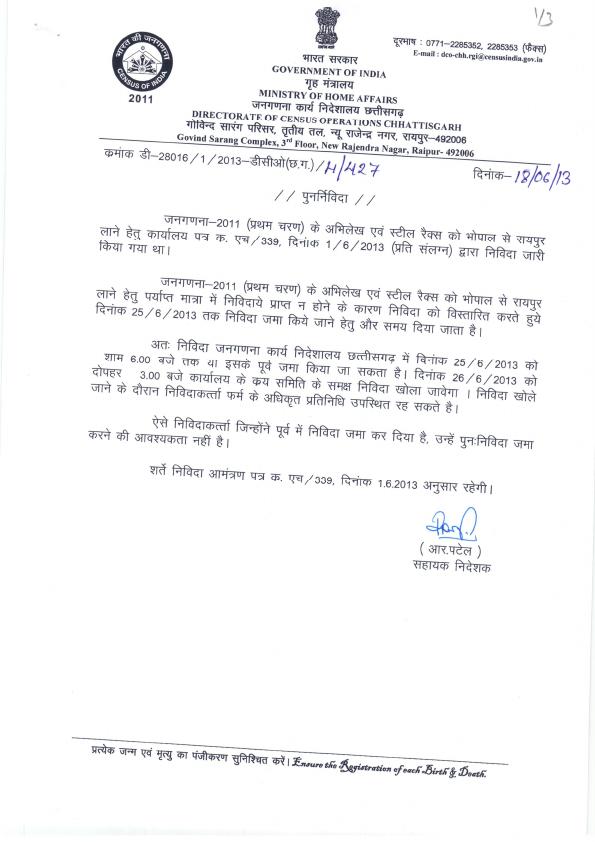 Re-Tender for transferring the Archives and Steel rack of NPR and census 2011(Ist phase) from Bhopal to Raipur [DCO- Chhattisgarh]
