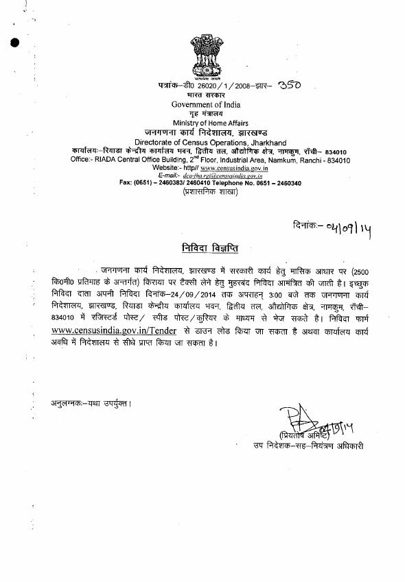 Tender for hiring of Taxi on monthly basis [DCO-Jharkhand]