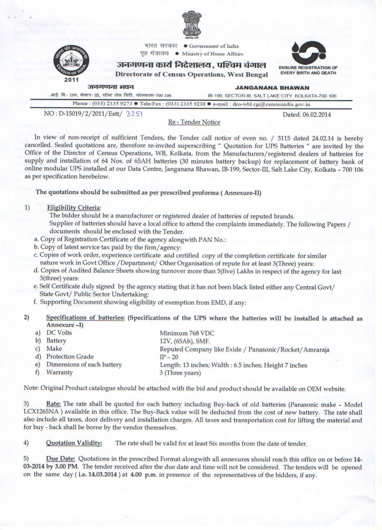 Re-tender for UPS Batteries [DCO-West Bengal]