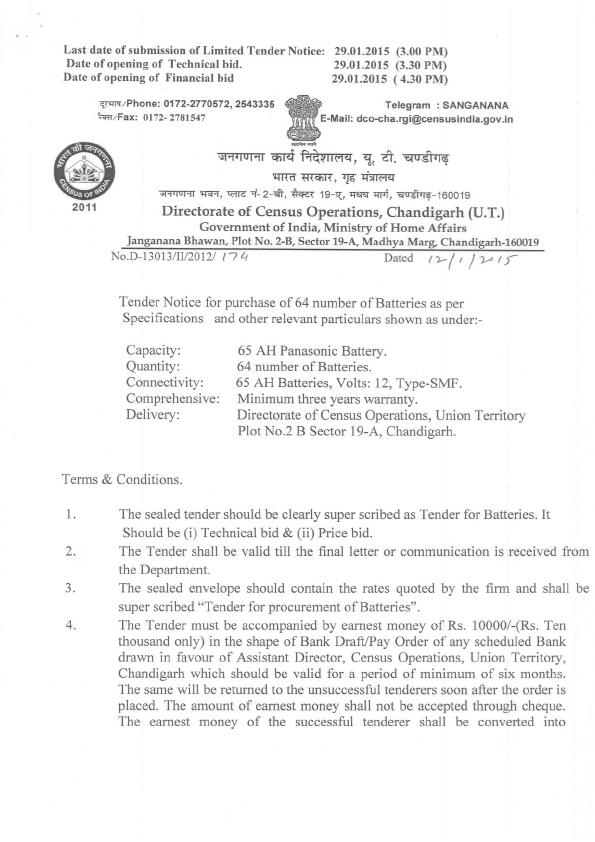 Tender For the Purchase of Batteries[DCO-Chandigarh]