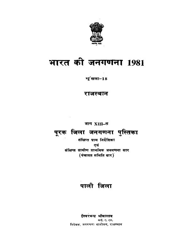 Complementary District Census Handbook, Pali, Part XIII-S, Series-18, Rajasthan - Census 1981