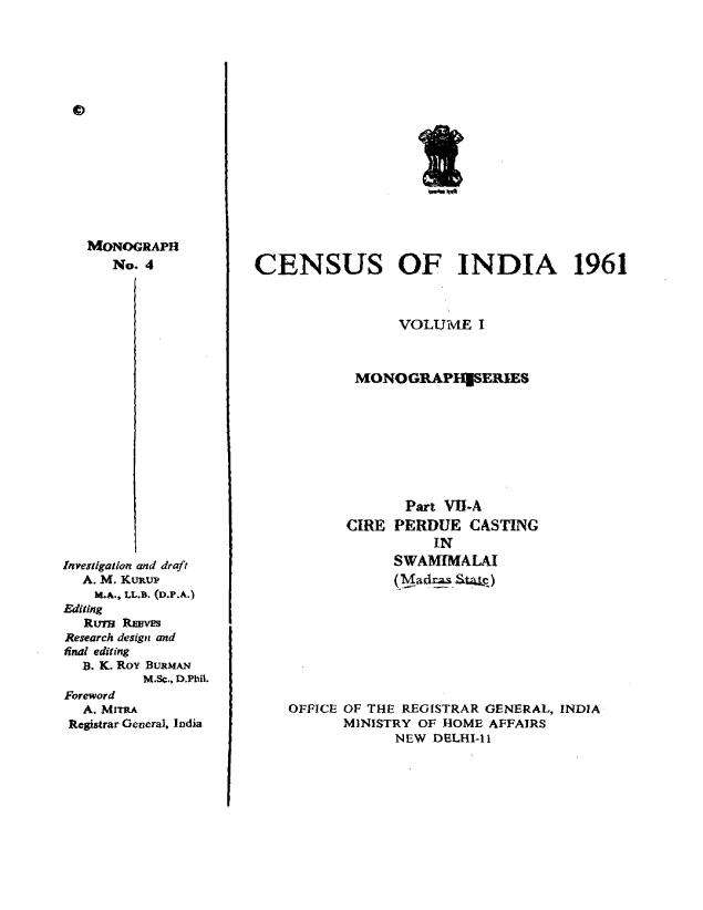 Monographs Series , Cire Predue Casting in Swamimalai, (Madras State) Part VII-A, Vol-I - Census 1961