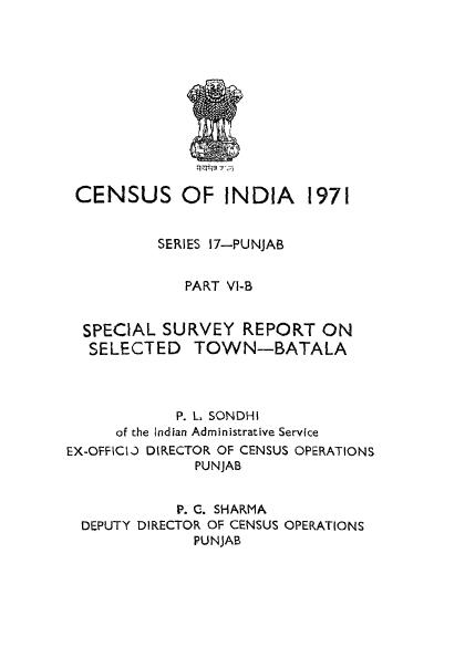 Special Survey Report On Selected Town-Batala, Part VI-B, Series-17, Punjab - Census 1971
