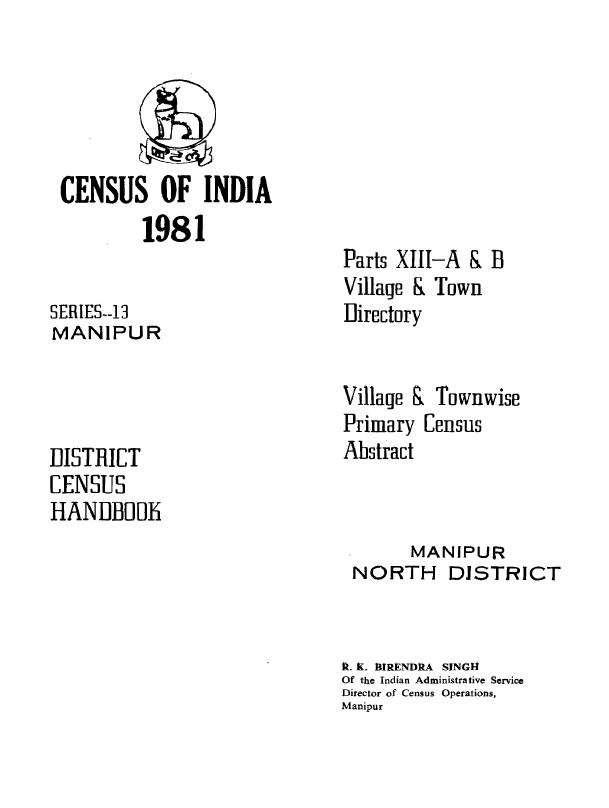 District Census Handbook, Manipur North, Part XIII A & B, Series-13, Manipur - Census 1981