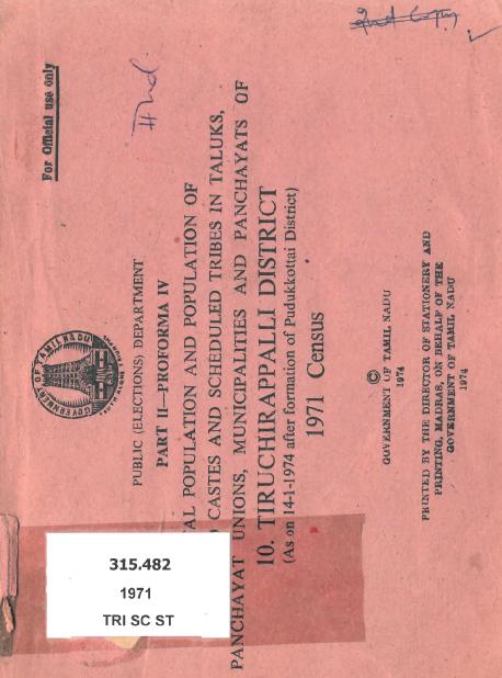 Final Population and Population of Scheduled Caste and Scheduled Tribes in Taluks, Panchayat Unions, Municipalities and Panchayats of, 10 Tiruchirappalli - Census 1971
