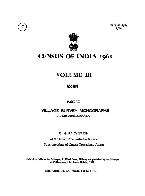 Village Survey Monographs, 11 Resubakrapara, Part VI, Vol-III, Assam - Census 1961