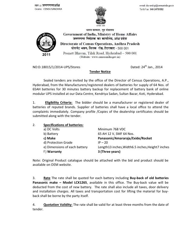 Tender for supply of 64 Nos. of 65AH batteries for 30 minutes battery backup for replacement of battery bank of online modular UPS installed at our Data Centre, Kendriya Sadan, Sultan Bazar, Koti, Hyderabad
