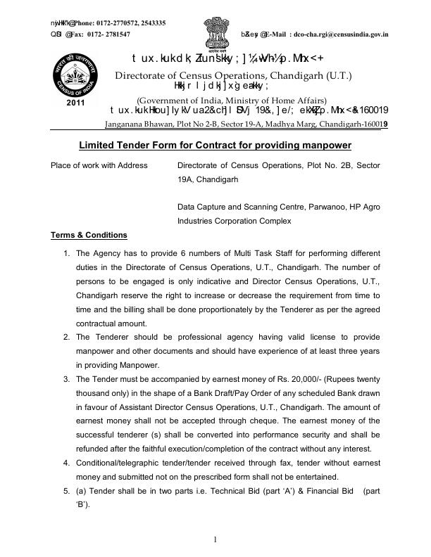 Limited Tender Form for Contract for providing Manpower [DCO - Chandigarh UT]