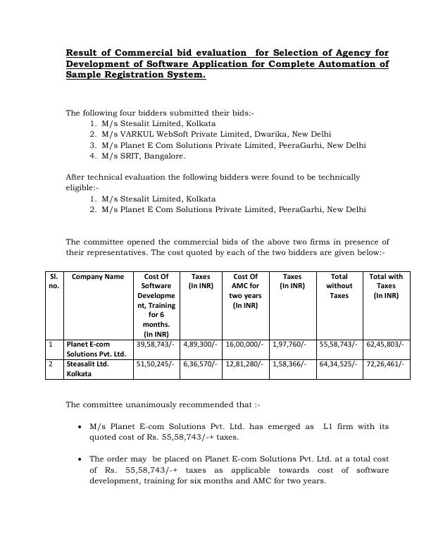 Result of Commercial bid evaluation for Selection of Agency for Development of Software Application for Complete Automation of Sample Registration System.
