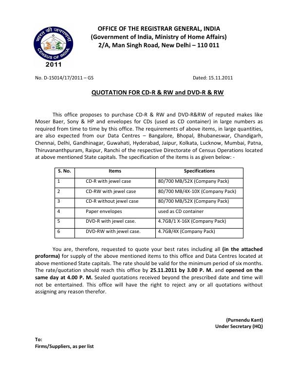 Quotation for purchasing CD-R & RW and DVD-R & RW of reputed makes like Moser Baer, Sony & HP and envelopes for CDs (used as CD container) in large numbers (ORGI - New Delhi)